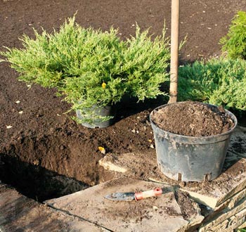 После посадки обязательно нужно хорошо пролить растение, даже во время дождя, который никогда не промачивает почву глубоко. Кроме того, поливка уплотнит почву, что позволит избежать пустот, заполненных воздухом. Это относится в первую очередь к лиственным. При посадке хвойные растения не стоит слишком сильно поливать, особенно в прохладную и влажную погоду, поскольку в переувлажненной почве корням растений не будет хватать кислорода и они начнут отмирать. Конечно, перед посадкой нужно полить растение в контейнере и проследить, чтобы ком был влажным, но нельзя создавать «болото».