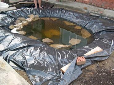 Итак, выбираем саму плёнку. Если ваш пруд не слишком большой и глубокий (до 1,5 м. глубиной), то вам будет достаточно ПВХ плёнки от 0,5 до 1 мм. толщиной. Если же пруд достаточно большой и глубокий, то потребуется ПВХ или бутилкаучуковая плёнка большей толщины, 1мм. и более. Бутилкаучук более прочный и долговечный материал (срок службы такой плёнки может достигать 30 и более лет.), но так же это и достаточно дорогой материал. ПВХ плёнка немного уступает в долговечности (прослужит вам от 7 до 15 лет), но и цена на неё более приемлема. Существует несколько расцветок плёнок для пруда, но самой удачной и беспроигрышной считается чёрный цвет.